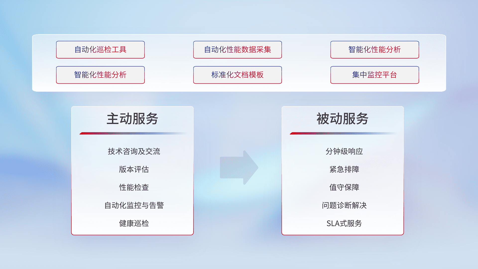 智能化工具和标准化文档,,,保障服务质量,,提供主动服务(包含技术咨询、、、、版本评估、、、、性能检查、、自动化监控与告警、、健康巡检)和被动服务包含(分钟级响应、、、紧急排障、、值守保障、、问题诊断解决、、、、SLA服务)。。。。